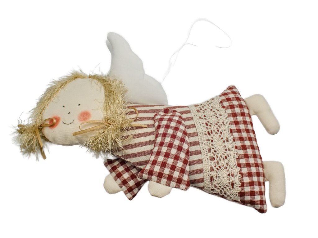Andělka létací má šatičky z tmavě zeleného kanafasu, ladí s naší kolekcí červených a tmavě zelených textilních doplňků.