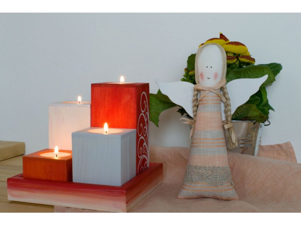 Andělka ušitá ze lněné hnědo-pískové látky, plněná dutým vláknem, zdobená krajkou, vlásky z vlněné příze (vlna + akryl), očka malovaná barvou na textil, křidélka z bílého pěnového papíru moosgummi.