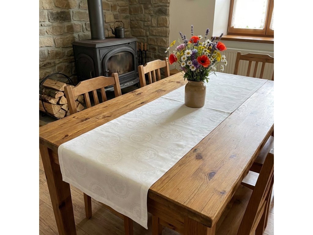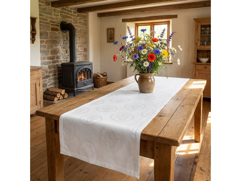 Sváteční stolování vyžaduje pěkný běhoun. Tento bílý běhoun je prostě tradičně slavnostní s jemným květinovým vytkaným vzorem.