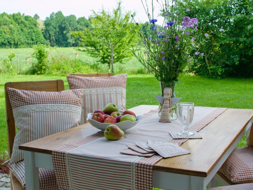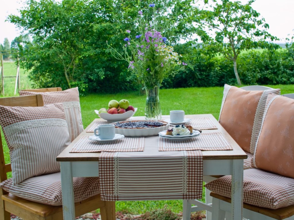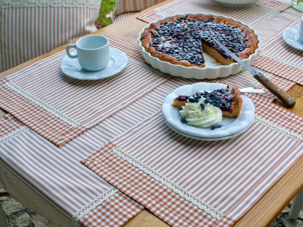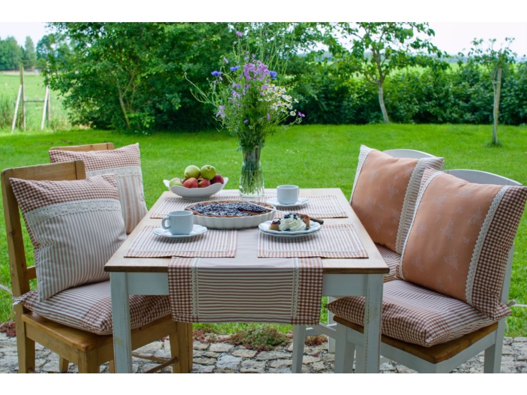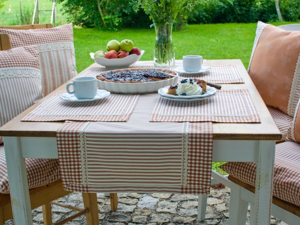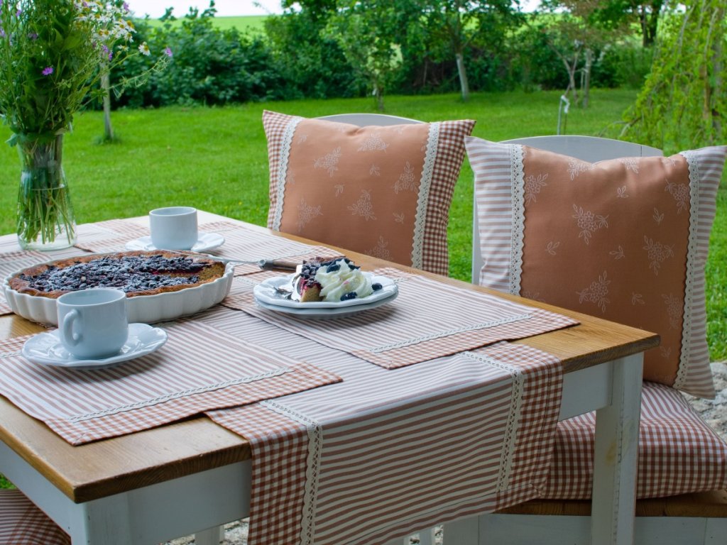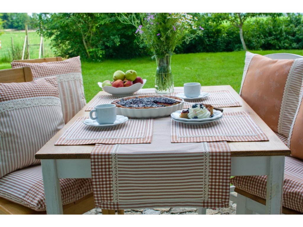 Běhoun z kanafasu můžete na chalupě doplnit prostírkami a dalšími doplňky z rezavé kolekce.