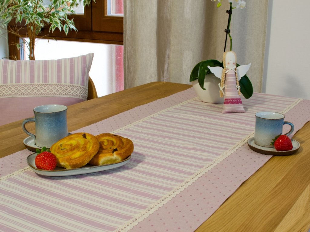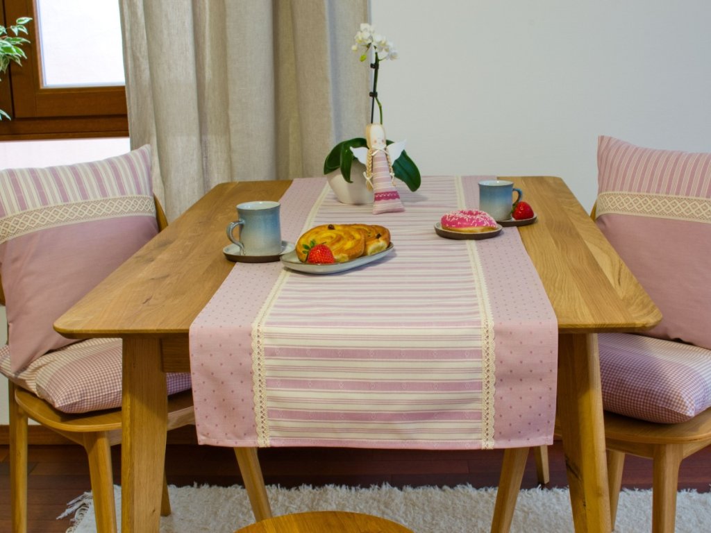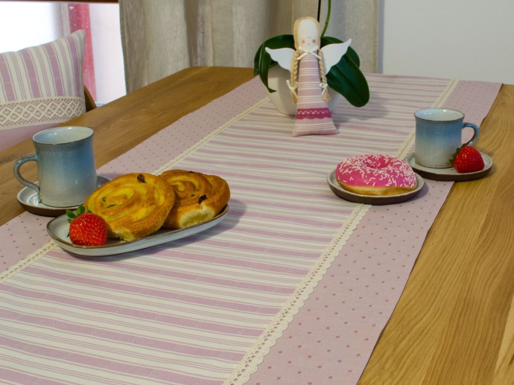 Běhoun z kanafasu kombinovaný s žakárem kytičky zdobený jemnou režnou krajkou je vhodný pro sváteční příležitosti.