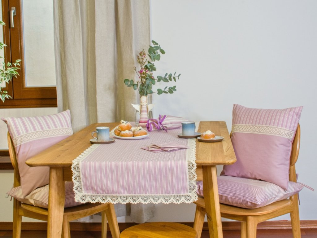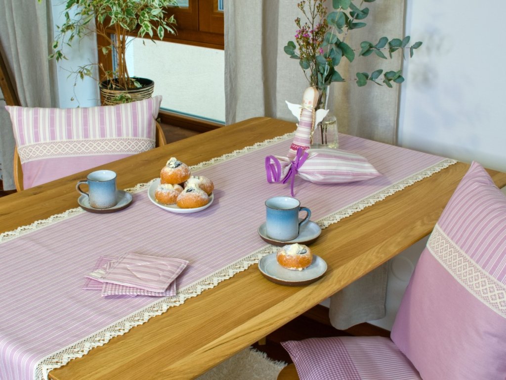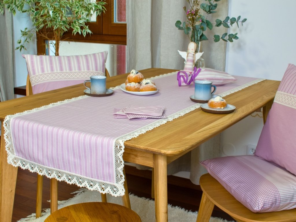 Běhoun ušitý z tradičního růžového kanafasu – v jemných kostičkách nebo proužcích – vnese na váš stůl radostnou a zároveň útulnou atmosféru. Lemování širší režnou krajkou dodává běhounu rustikální kouzlo a zvýrazňuje jeho venkovský charakter. Skvěle se hodí jak na chalupu, tak i do moderní domácnosti, která touží po kousku poctivého českého textilu.