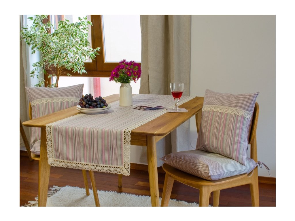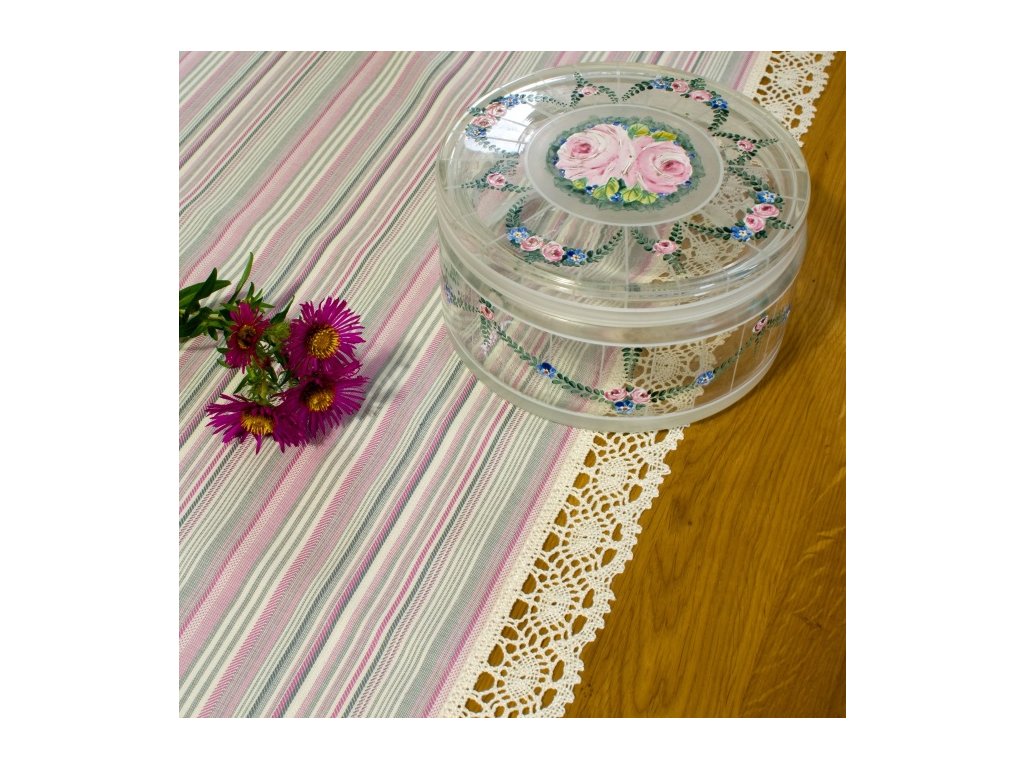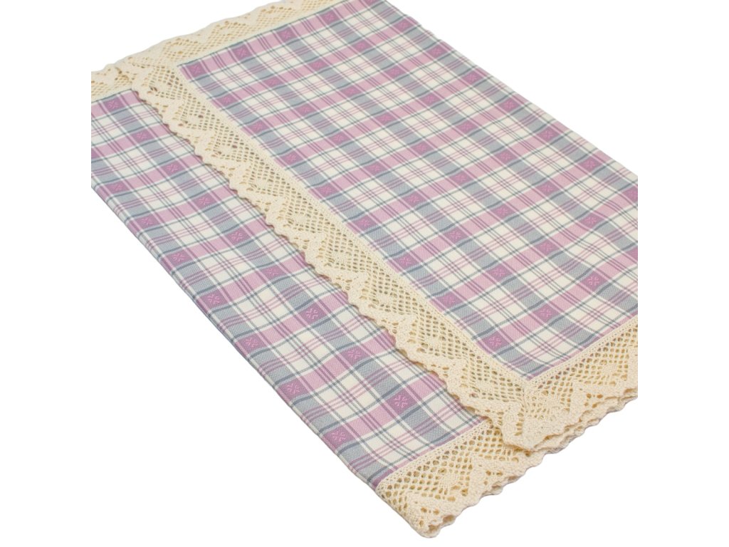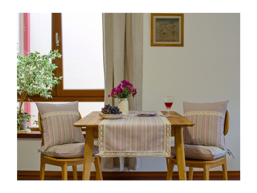 Kombinace šedé a růžové barvy působí jemně, přesto veselým dojmem. Běhoun z tradičního kanafasu – ať už v kostičkách nebo proužcích – je olemovaný širší režnou krajkou, která zvýrazňuje jeho venkovský charakter. Skvěle vynikne na chalupě nebo venkovském interiéru, kde přinese teplo a kousek české tradice.