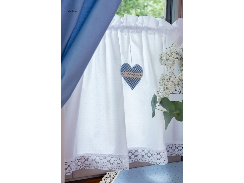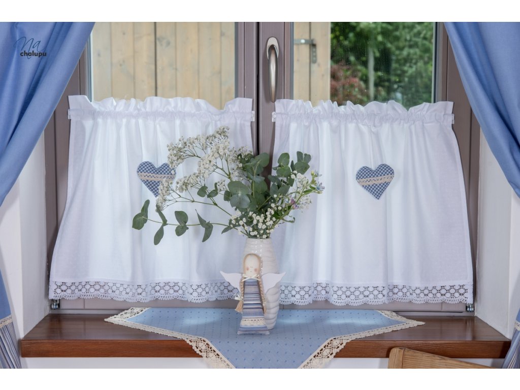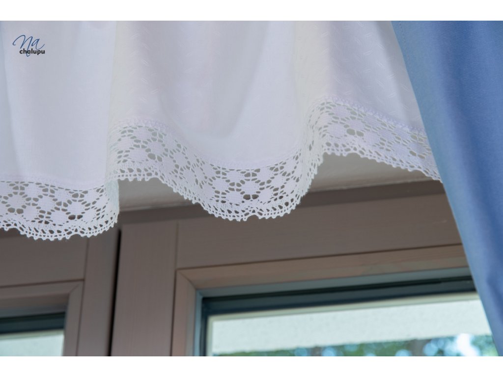 Něžná bílá záclonka z jemného žakáru s vytkanými peříčky ozdobená krajkou se vzorem s kolečky.