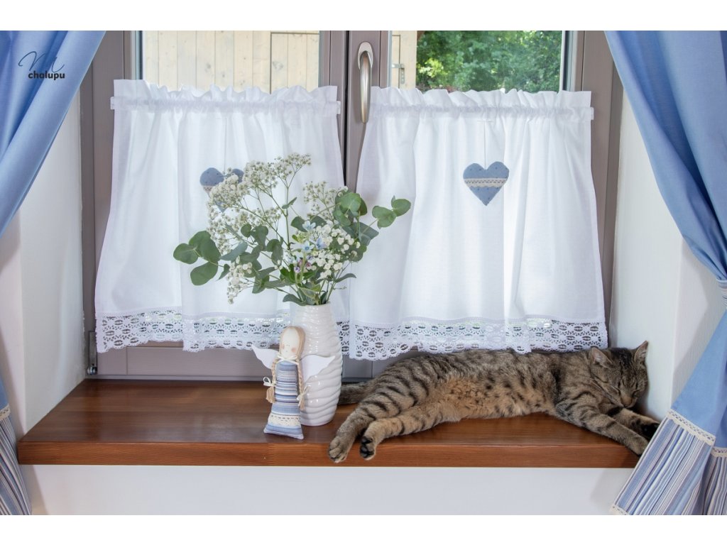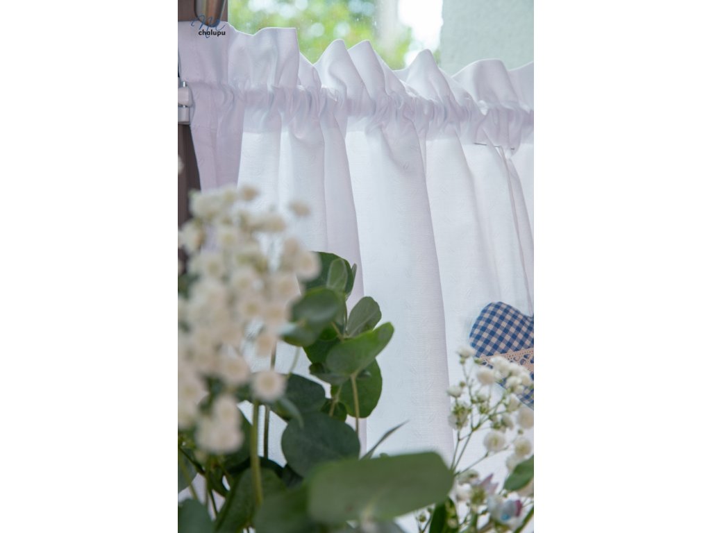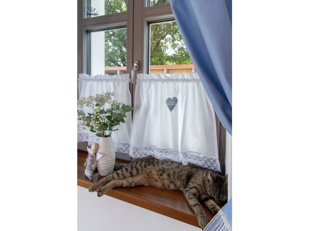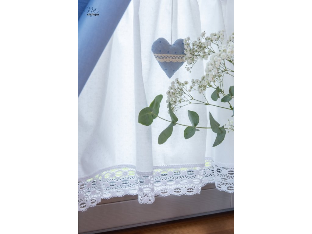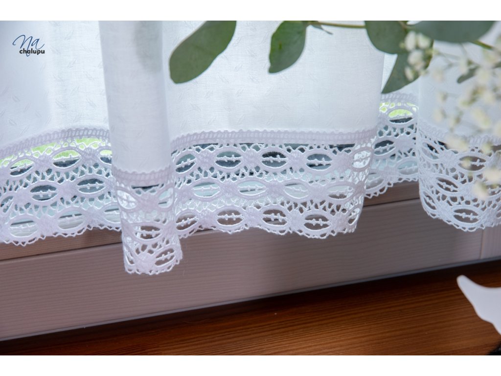 Něžná bílá záclonka z jemného žakáru s vytkanými peříčky ozdobená krajkou se vzorem vlnek.