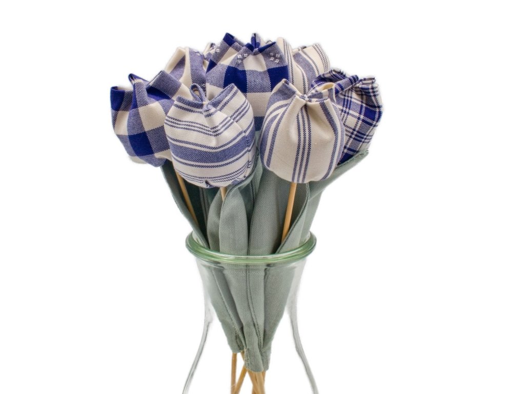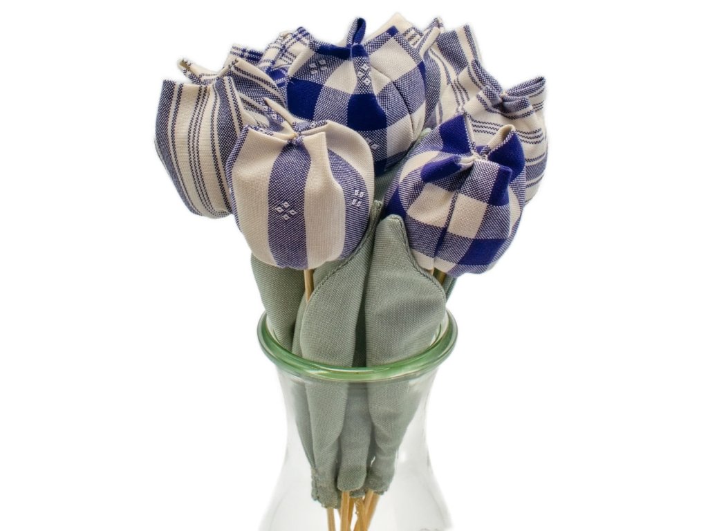 Červené a modré tulipány z kanafasu