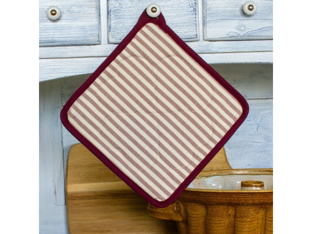 Chňapku - podložku z vínového "Bordó" kanafasu můžete na chalupě doplnit doplňky ze stejné kolekce.