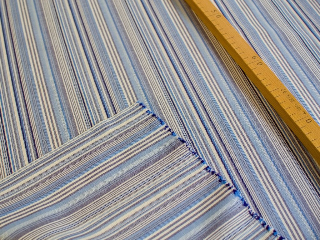 Nepravidelné pruhy ve dvou odstínech modré - strídavě plátnová a keprová vazba.