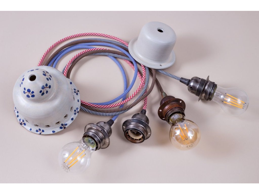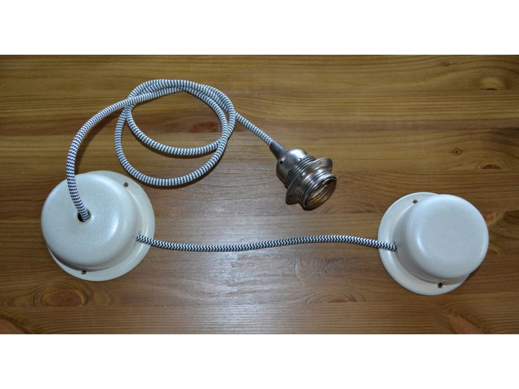Objímka E27 kovová s kroužkem + průchodka kabelu se svorníkem + textilní kabel 1m + závěs + svorkovnice