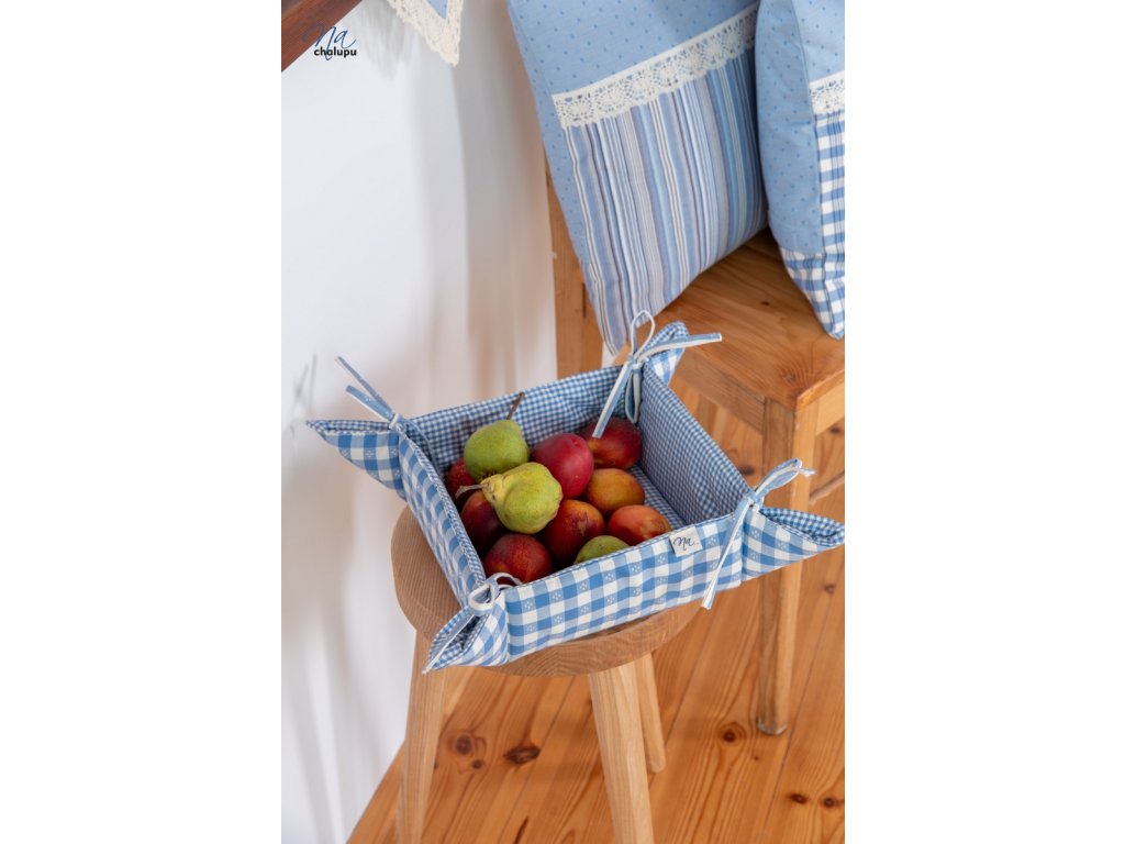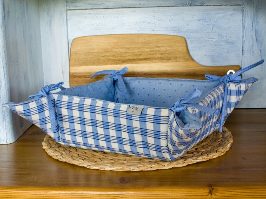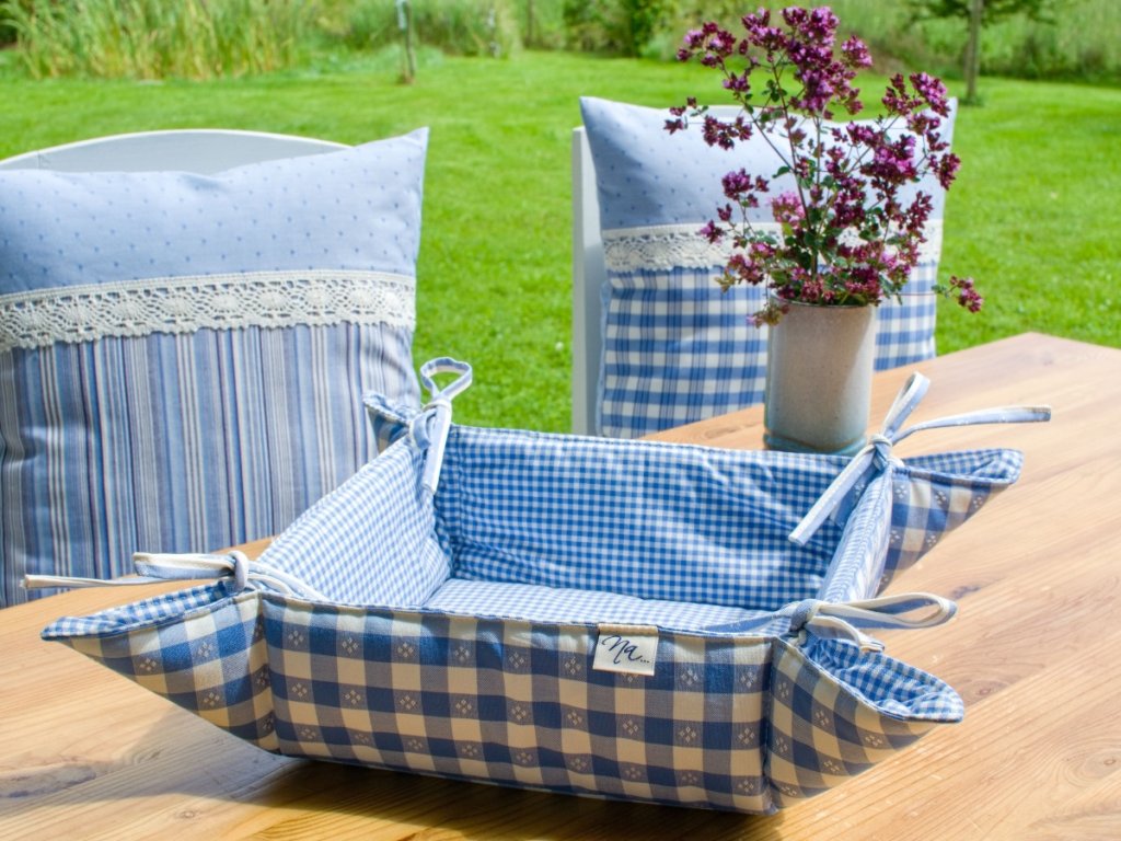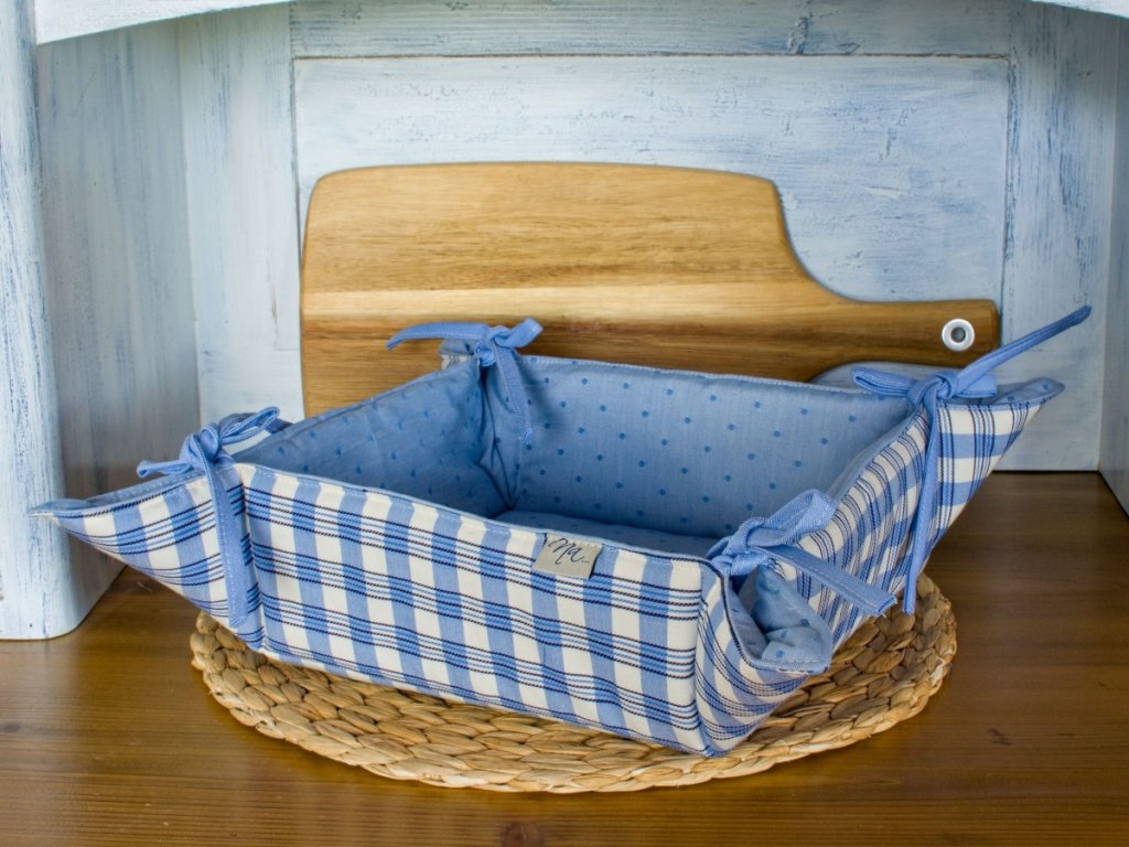 Košík z béžového kanafasu můžete na chalupě doplnit doplňky z pomněnkové kolekce.