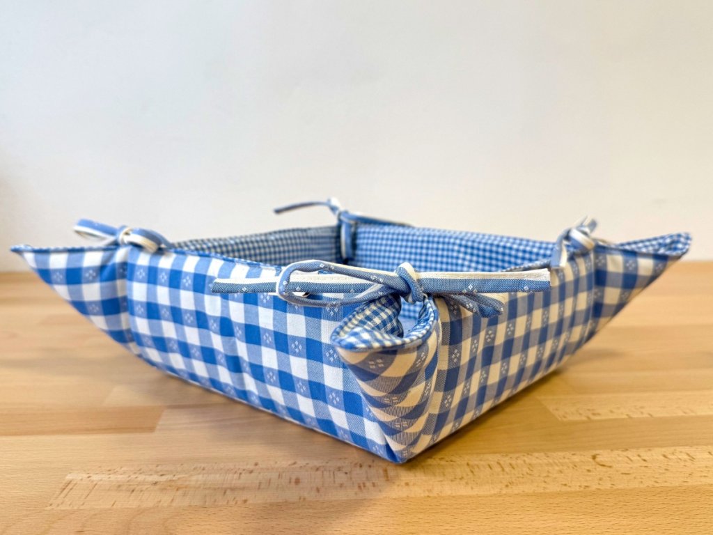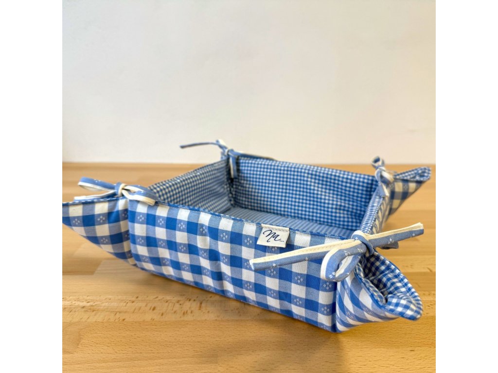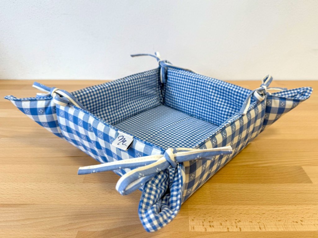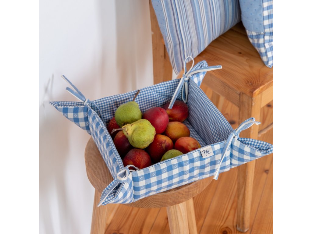 Košík z béžového kanafasu můžete na chalupě doplnit doplňky z pomněnkové kolekce.