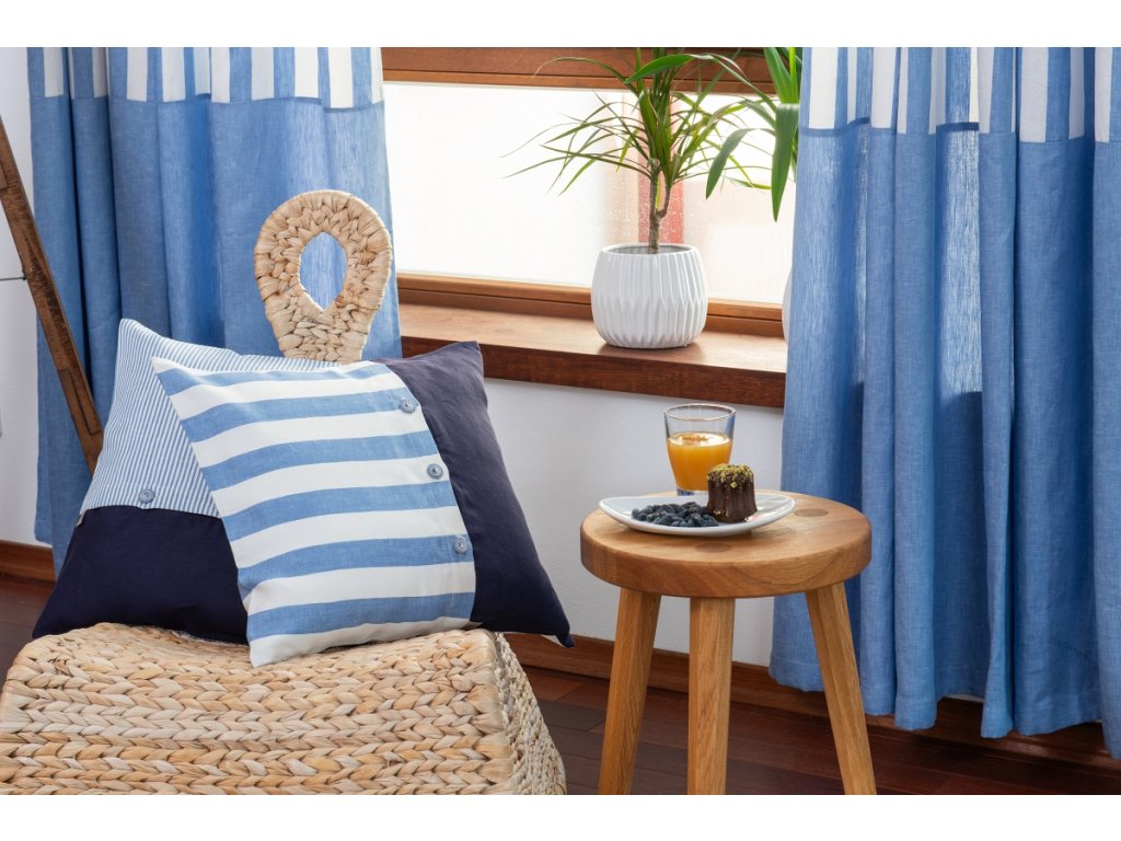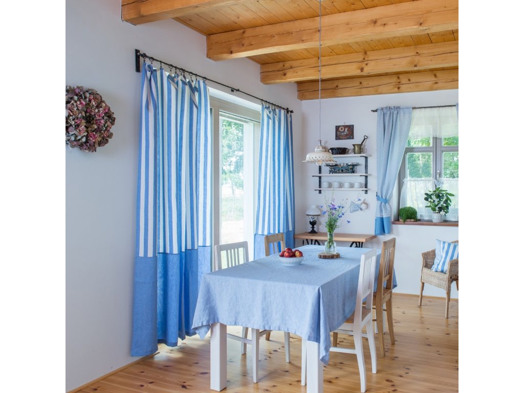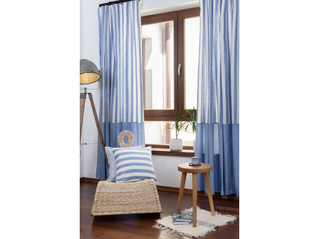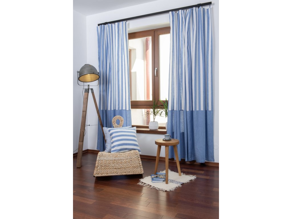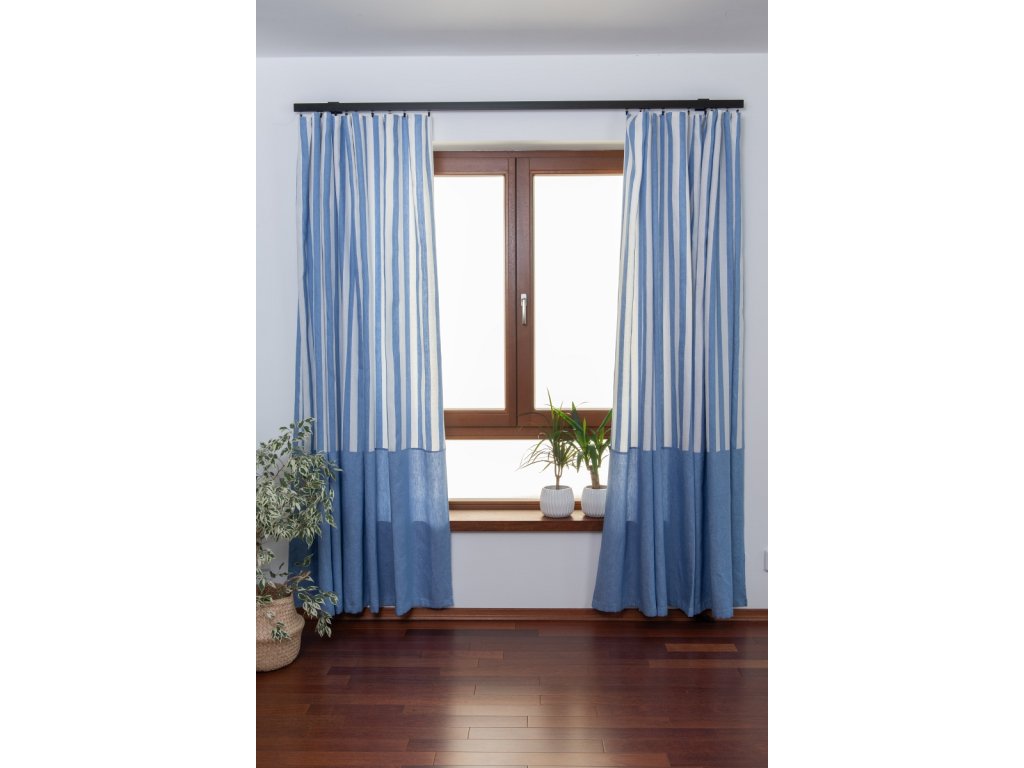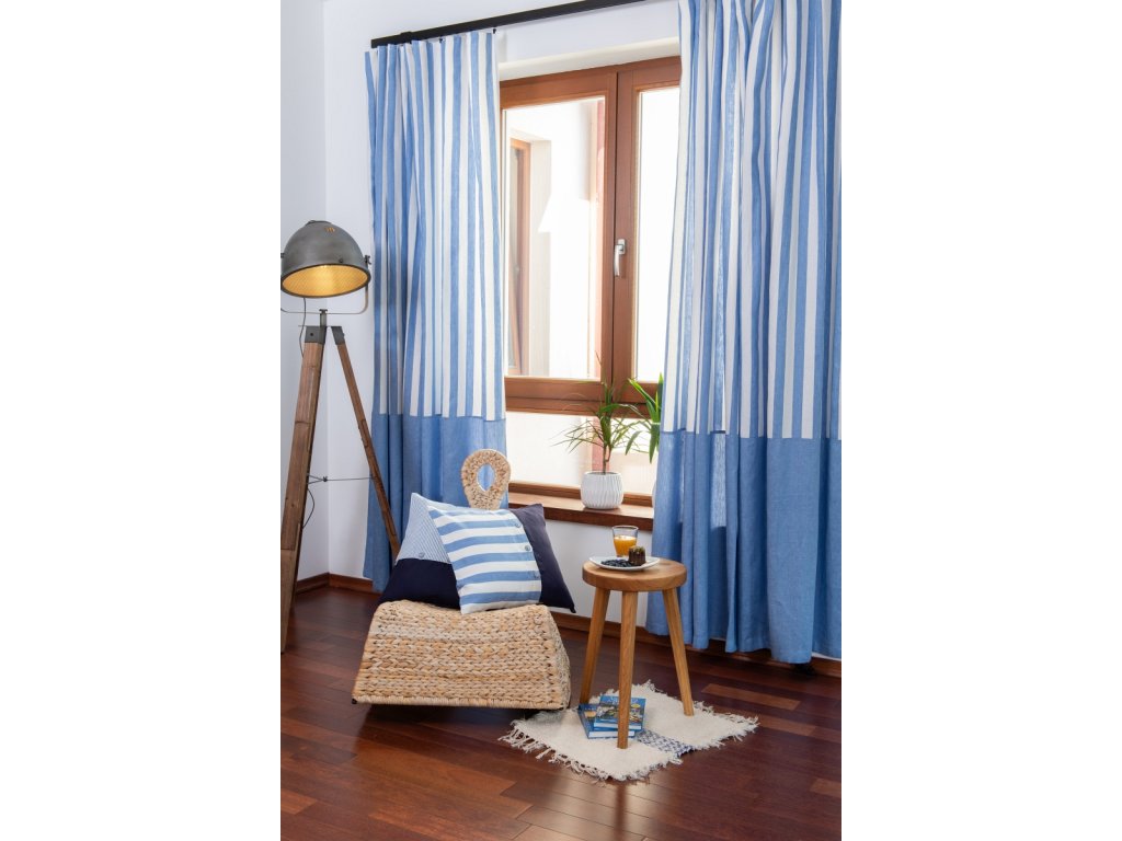 Světle modrá barva pruhů připomíná letní moře a bílé domky v Řecku. Závěsy kw3 jsou ušity z kvalitního lnu v keprové vazbě, která látce dodává jemnou strukturu a přirozenou pevnost.