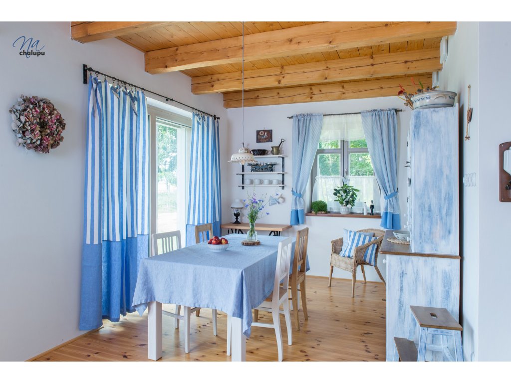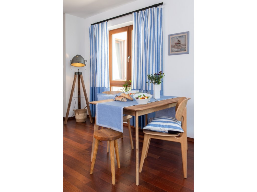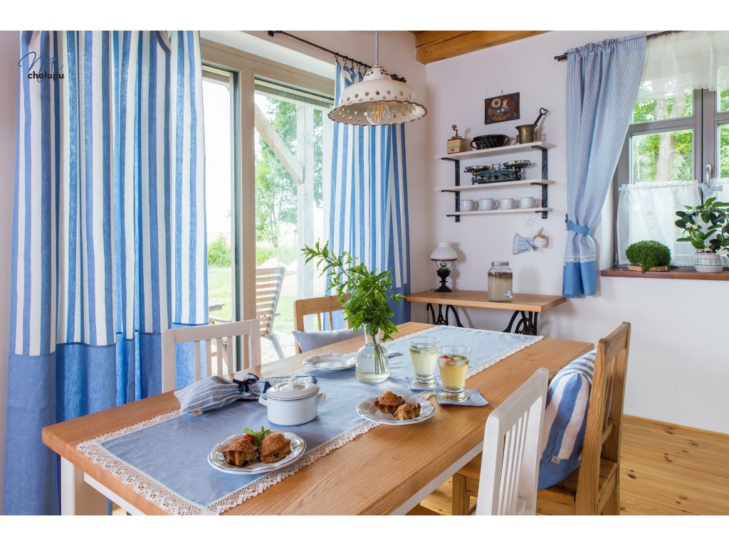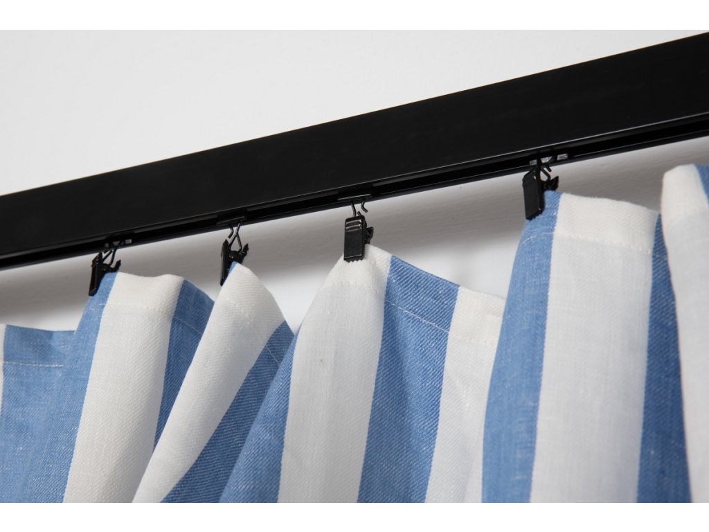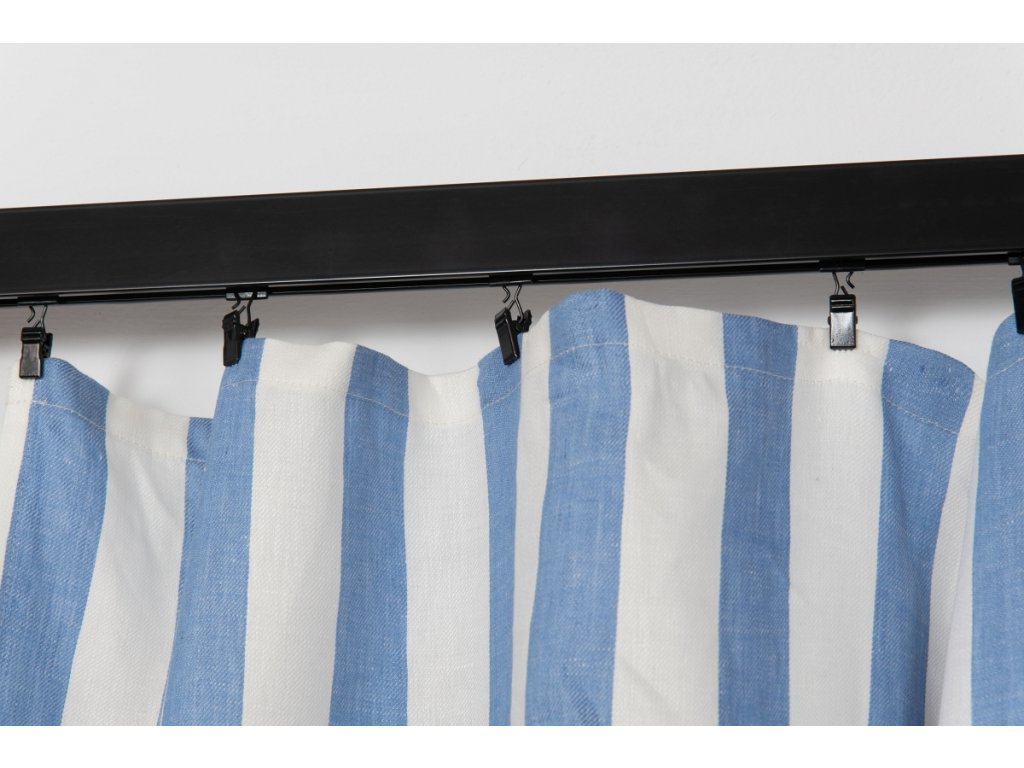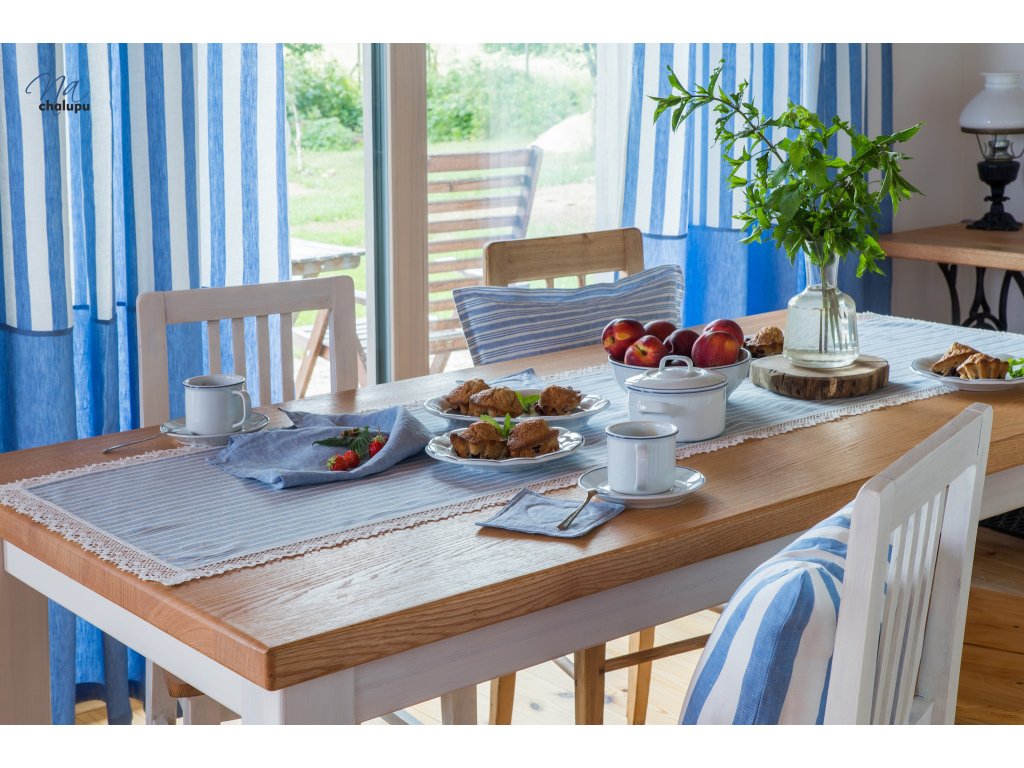 Světle modrá barva pruhů připomíná letní moře a bílé domky v Řecku. Závěsy kw3 jsou ušity z kvalitního lnu v keprové vazbě, která látce dodává jemnou strukturu a přirozenou pevnost.