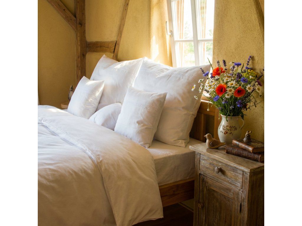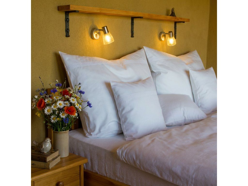 - Zdobnější provedení s krajkovou vsadkou na polštáři: Romantický dotek s jemnou krajkou, který přidává šarm a teplo. Tato varianta se skvěle hodí do venkovského stavení, chalupy nebo rustikálních interiérů, kde chcete vytvořit útulnou atmosféru plnou nostalgie.