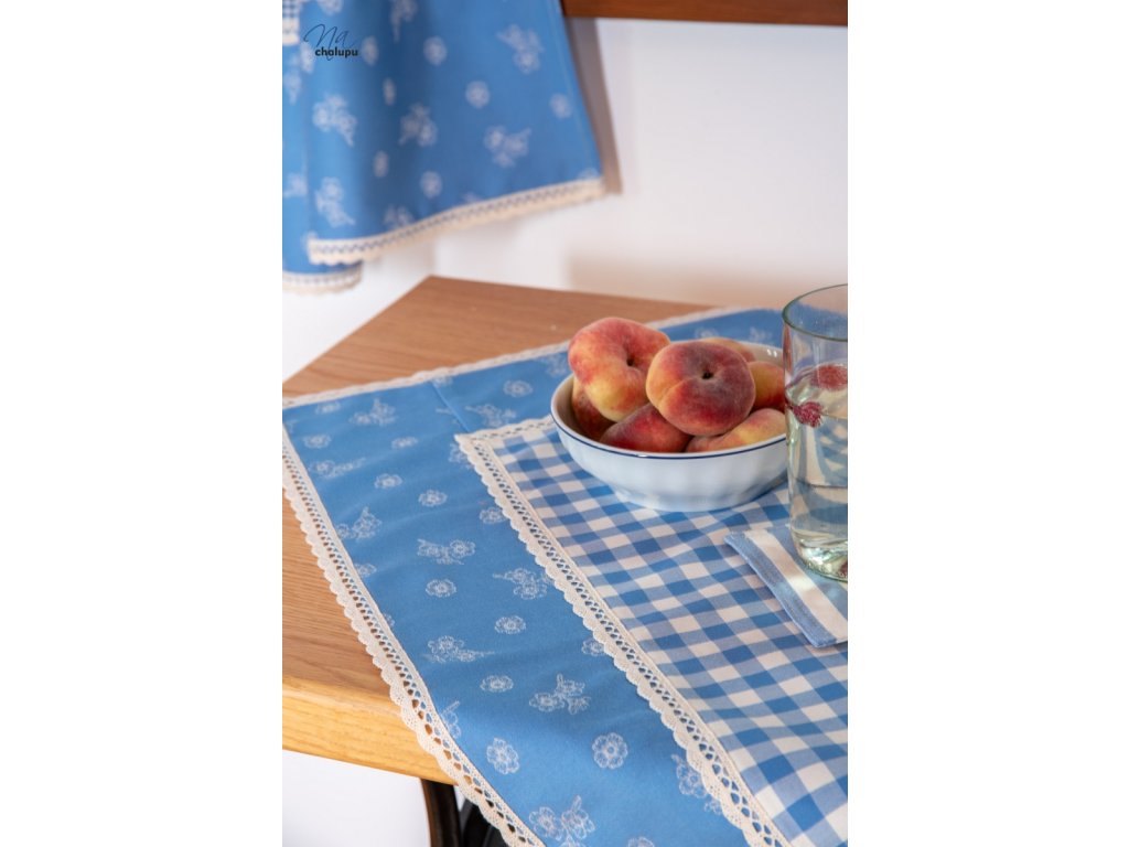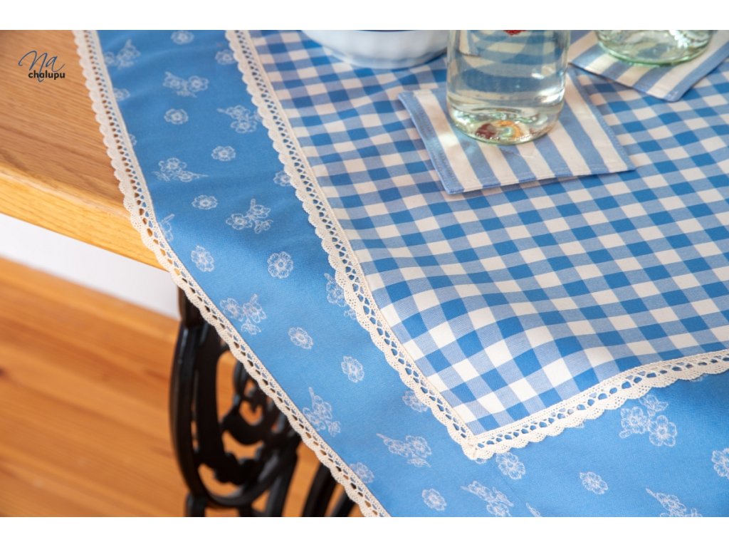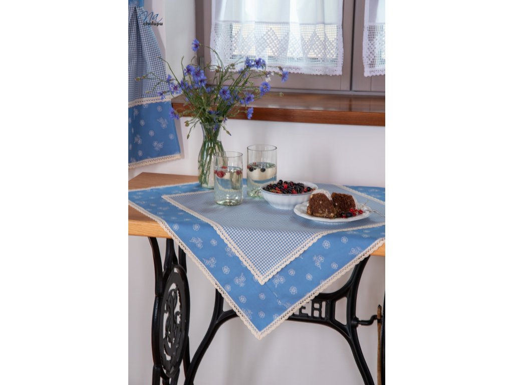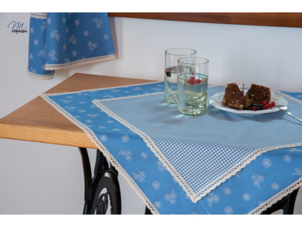 Zdobený středový ubrus na stůl z pomněnkového kanafasu a žakáru s režnou krajkou.