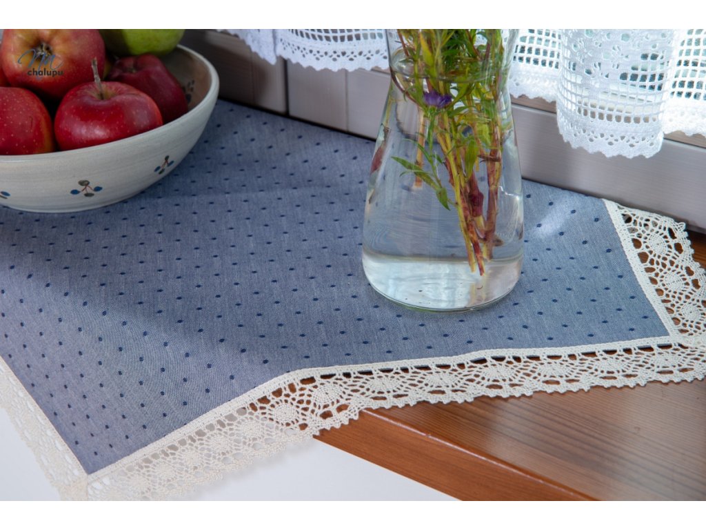 Napron s vytkaným puntíkovým vzorem přináší čistý, tradiční motiv, který působí přirozeně a nadčasově. Celý okraj je olemovaný širší, výraznou režnou krajkou, která dodá stolování jemný venkovský šarm a krásně vynikne i na zdobeném stole.