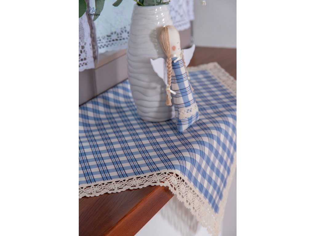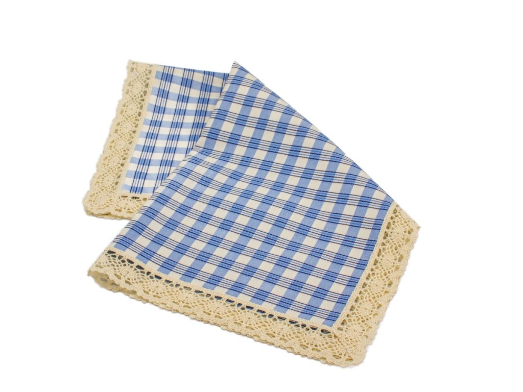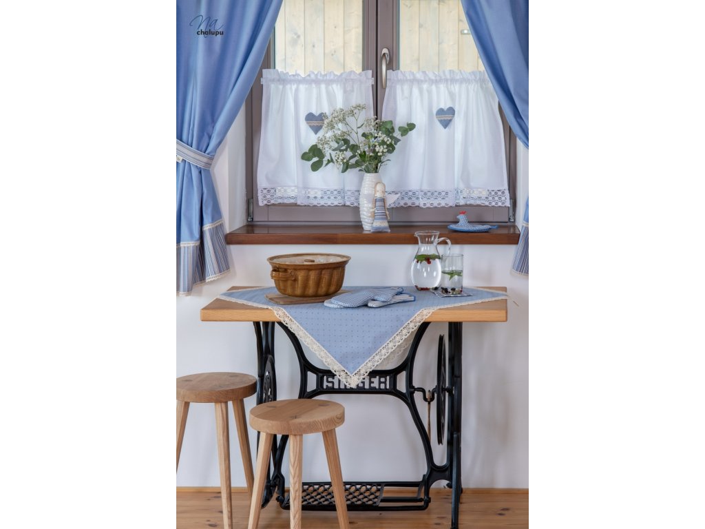 Napron z modrého kanafasu zdobený výraznou režnou krajkou je vhodný pro sváteční příležitosti.