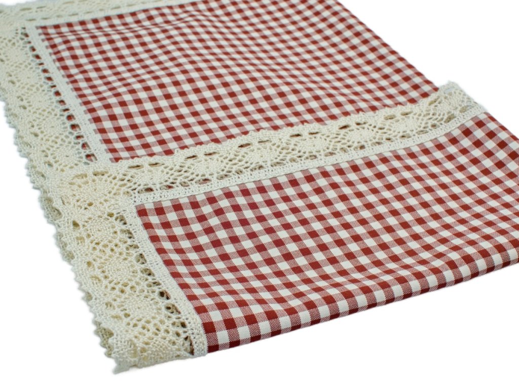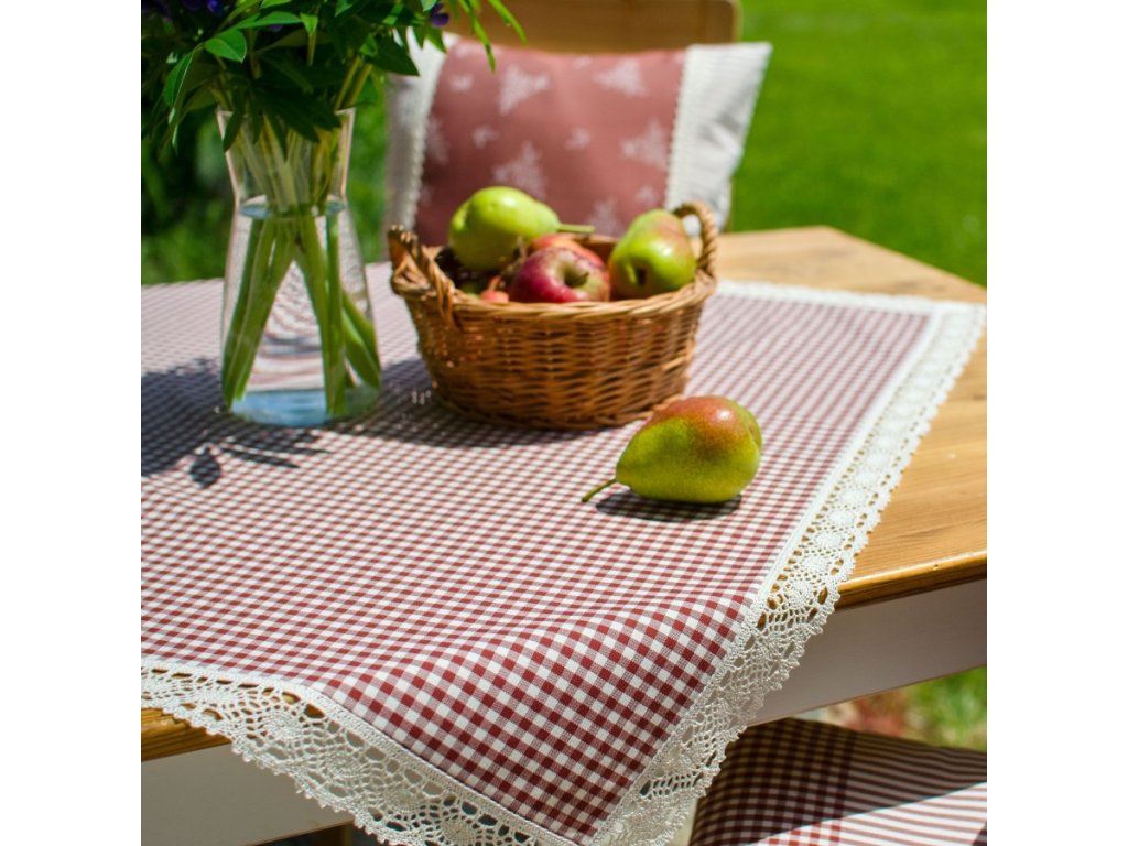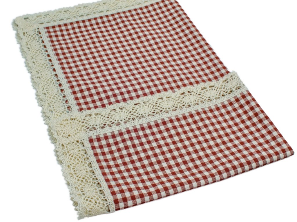 Napron z vínového kanafasu zdobený širokou režnou krajkou je vhodný pro sváteční příležitosti.