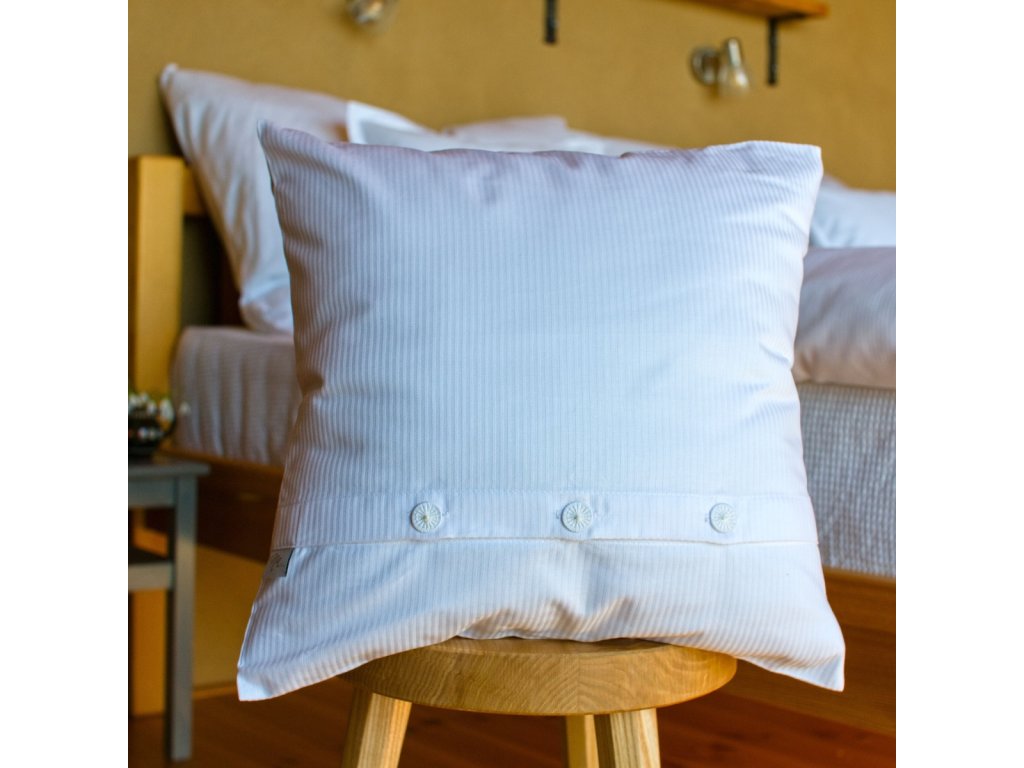 Dekorativní polštářek ze stejné kvalitní bavlny jako naše povlečení - s jemným tkaným proužkem v keprové vazbě a praktickým zapínáním na nitěné knoflíky.