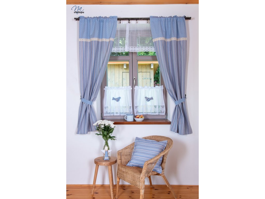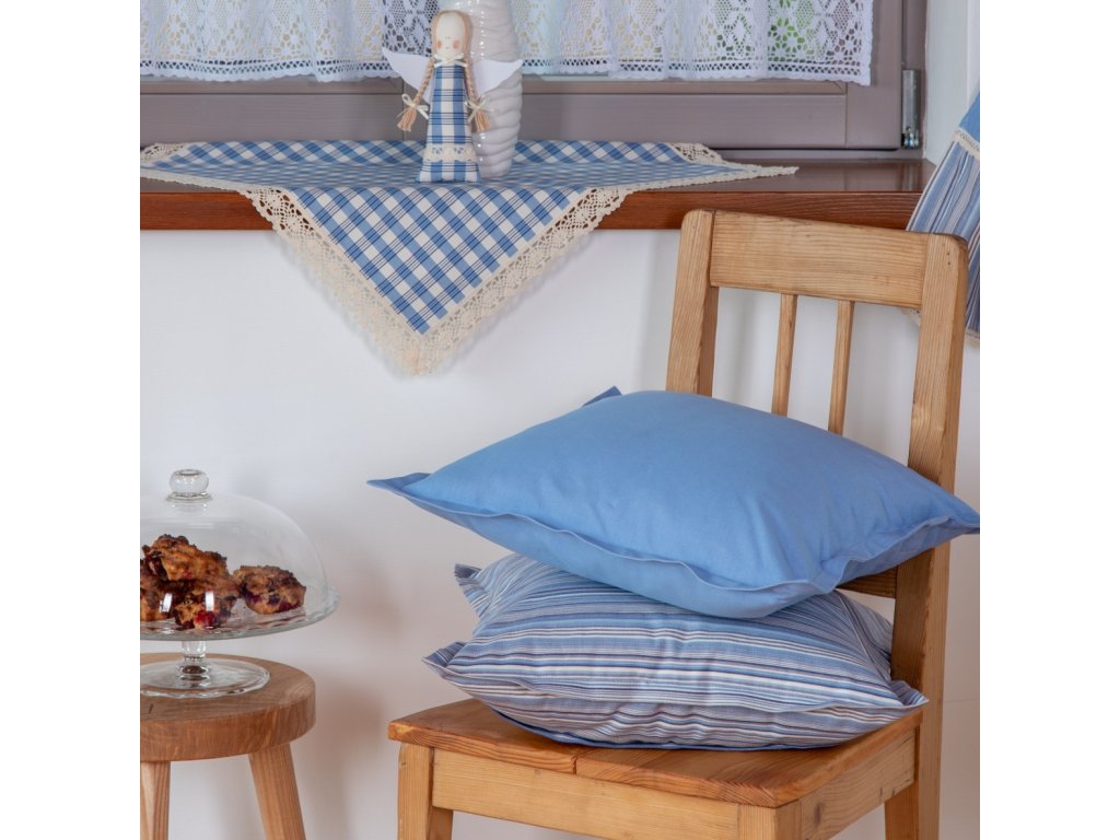 Polštářky z nové látky pomněnkové a tmavě modré nepravidelné proužky s dutým lemem. Tyto nepravidelné proužky jsou v plátnové i keprové vazbě, střídají se obě zelené. Polštářky mají dutý lem, který plní okrasnou funkci.