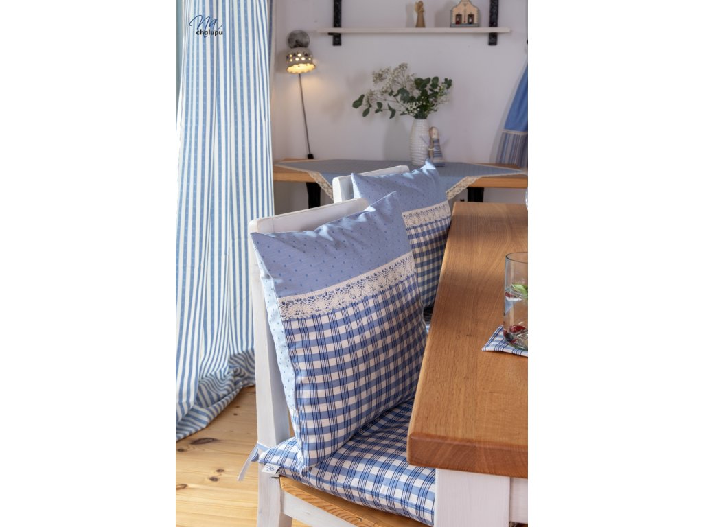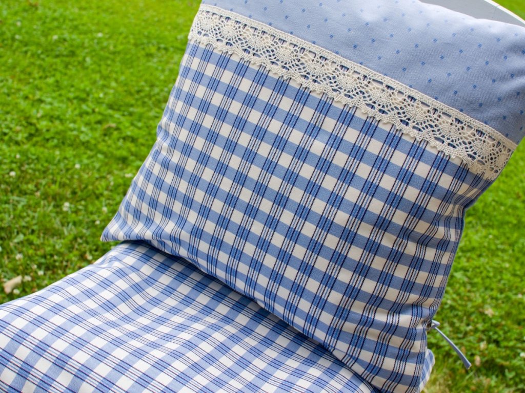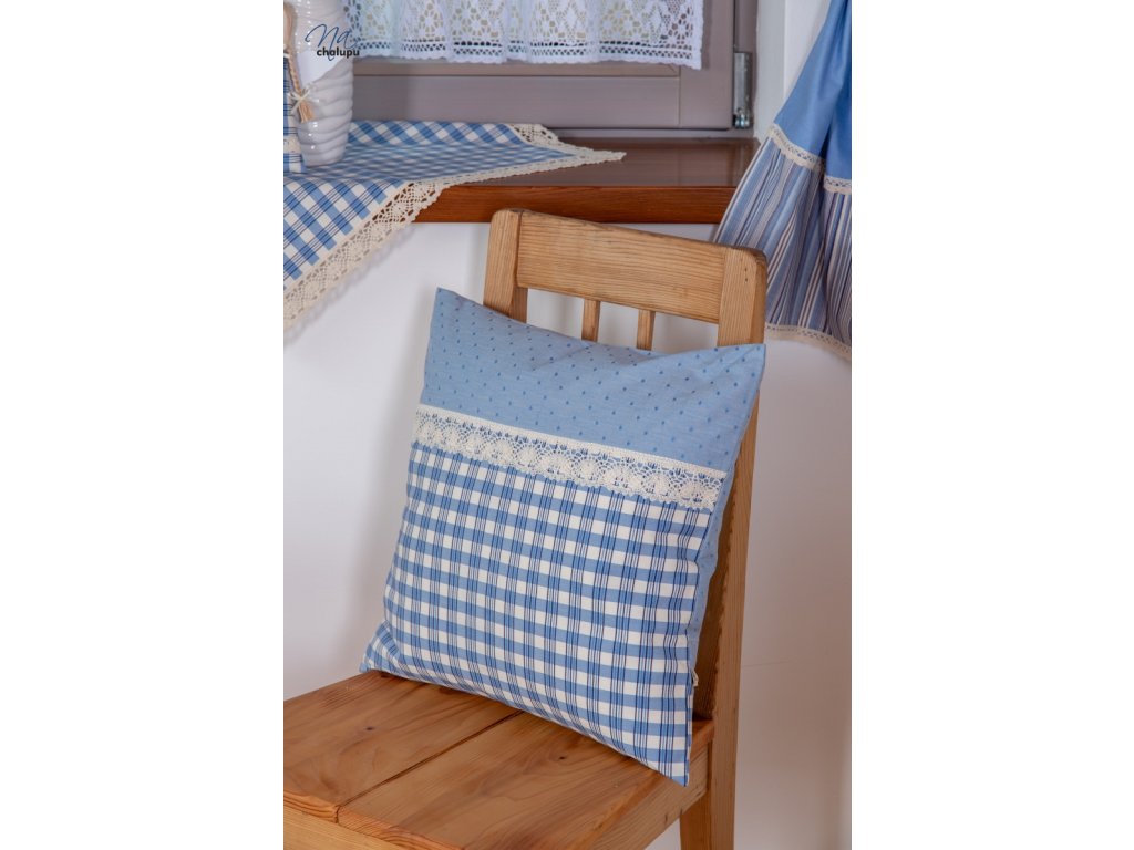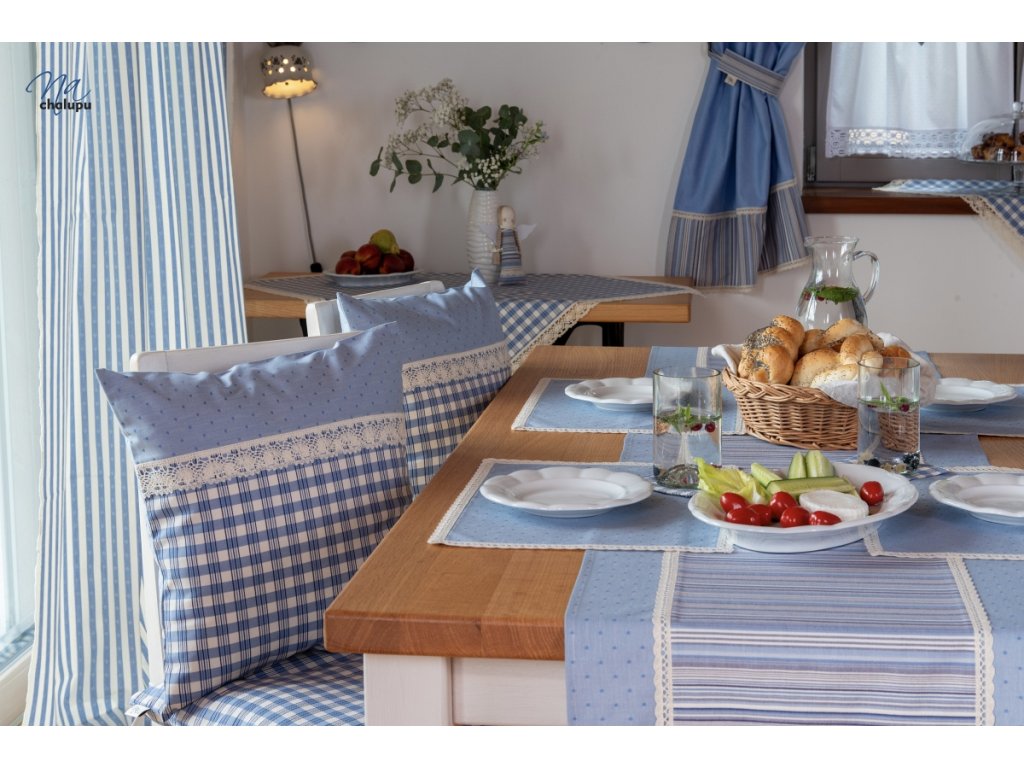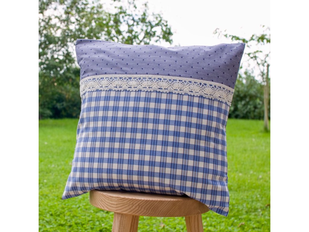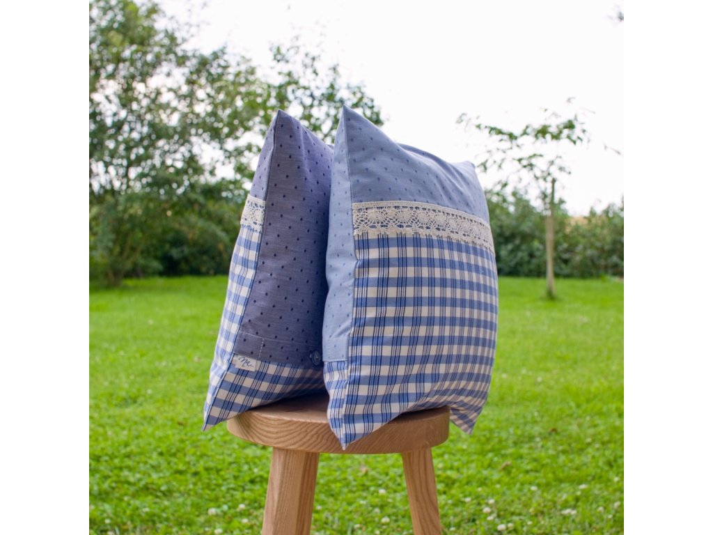 Polštářky světle modré nebo tmavě modré puntíky v obou našich odstínech modré ozdobené režnou krajkou. Keprové kostky opět kombinují pomněnkovou s tmavou modrou, barevné copánky vznikají díky keprové vazbě.