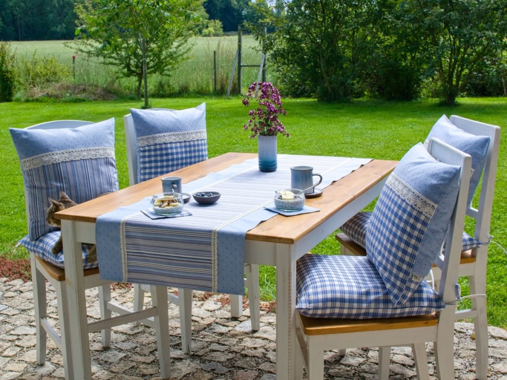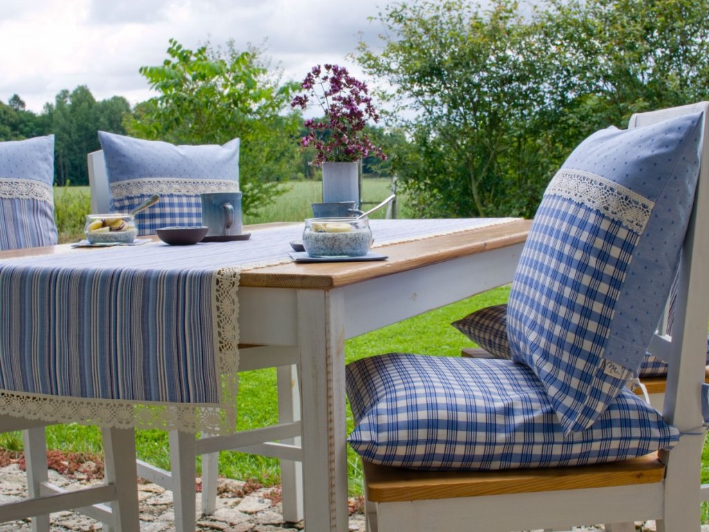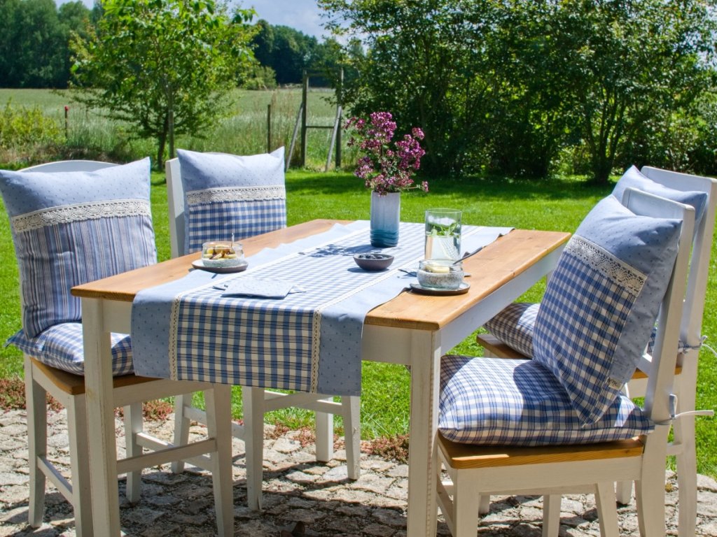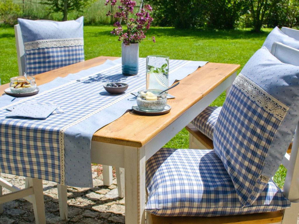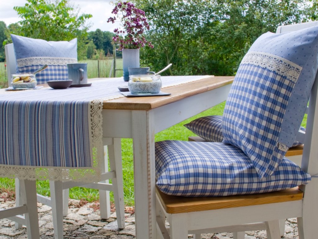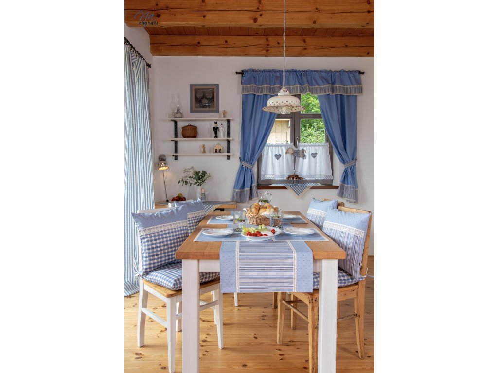 Polštářky světle modré nebo tmavě modré puntíky v obou našich odstínech modré ozdobené režnou krajkou. Keprové kostky opět kombinují pomněnkovou s tmavou modrou, barevné copánky vznikají díky keprové vazbě.