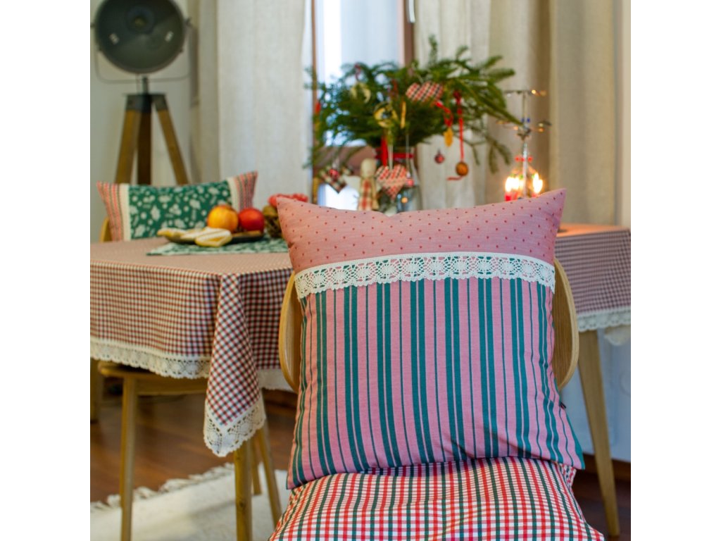 Povlak na polštář v červeno zelené kombinaci. Tmavé puntíky (červené nebo zelené) a červeno - zelené pruhy. Zelené pruhy jsou v keprové vazbě, takže výraznější, červené jsou v klasické plátnové vazbě.