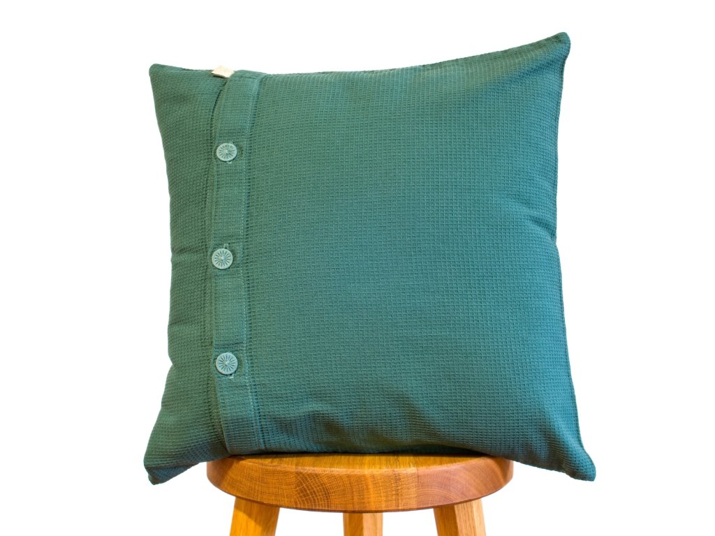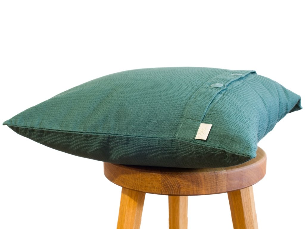 Jednoduché polštářky z tmavě zelené vafle jsou příjemné na spaní i jako dekorace.