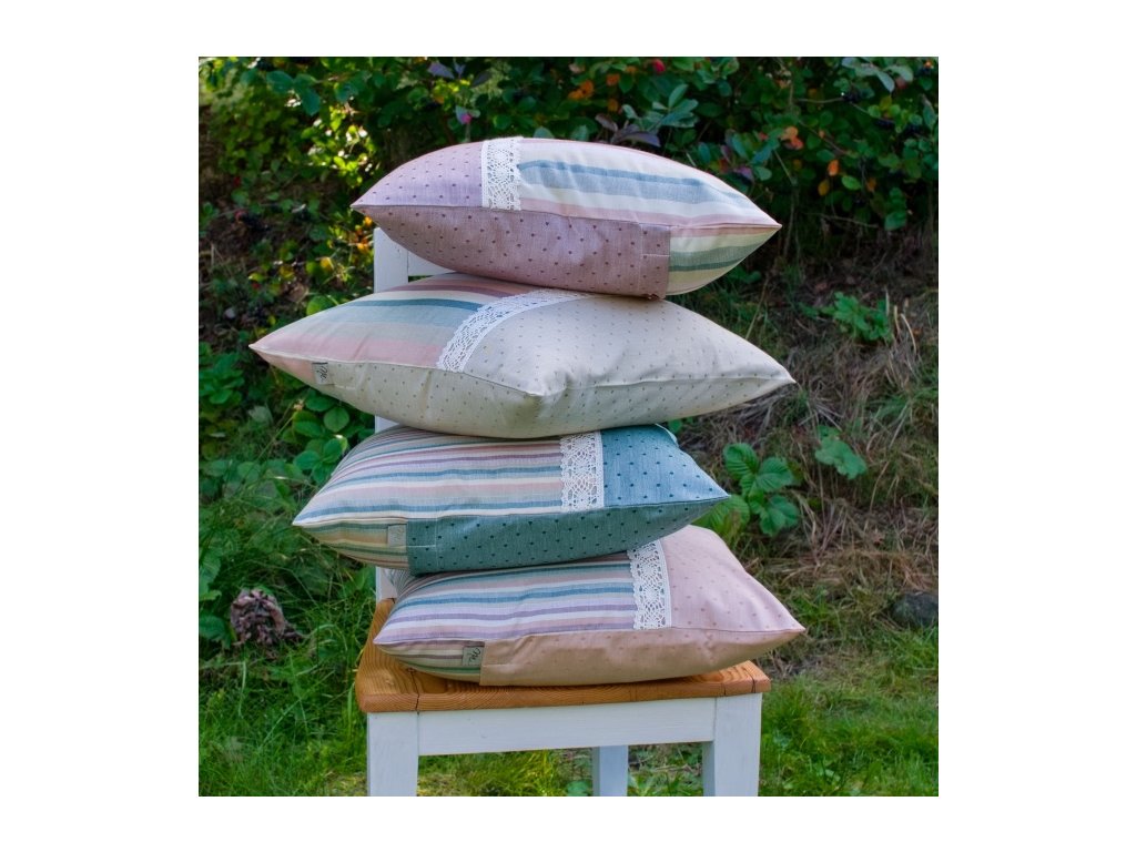 Polštářky s tmavě zelenými puntíky a pruhovaným kanafasem v barvách podzimu a režnou krajkou.