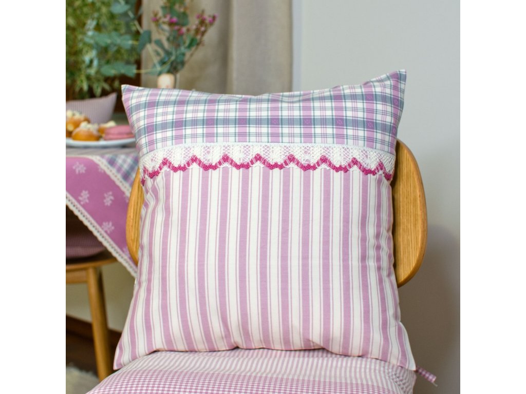 Polštářky s šedo-růžovými kostkami a růžovou krajkou v několika kombinacích.