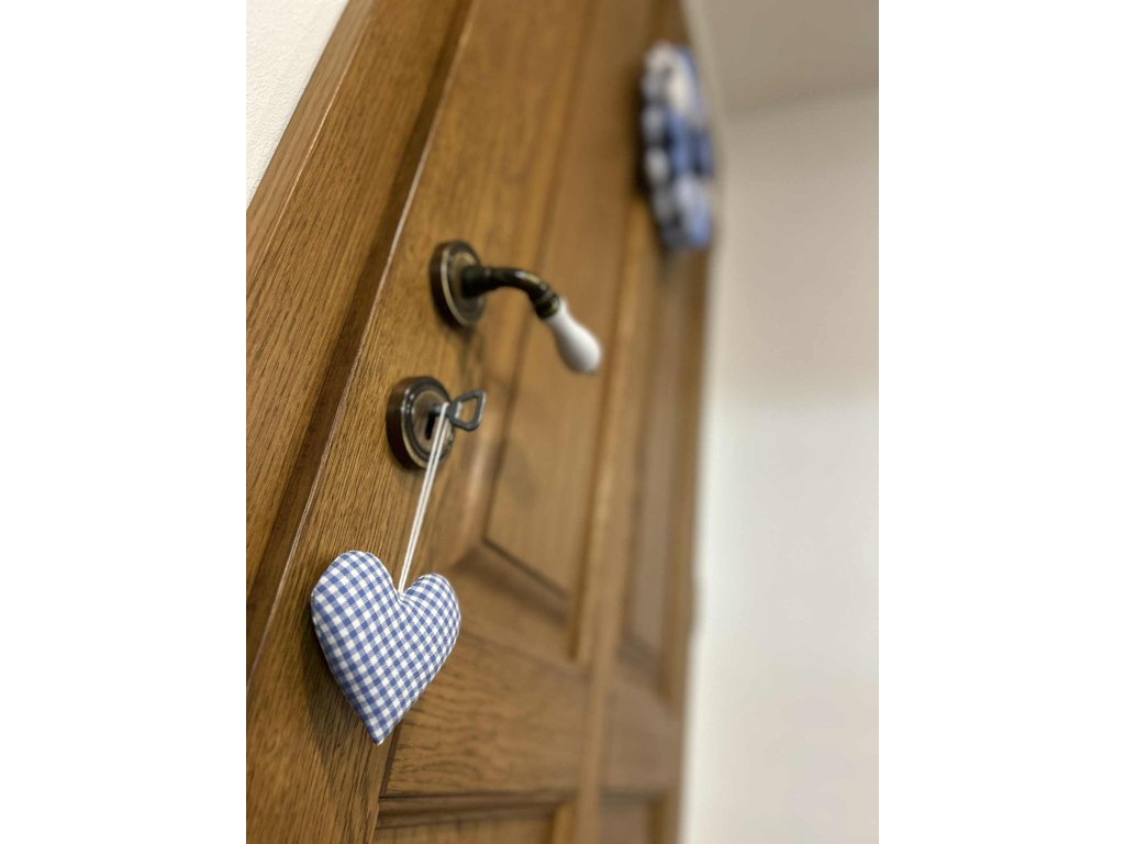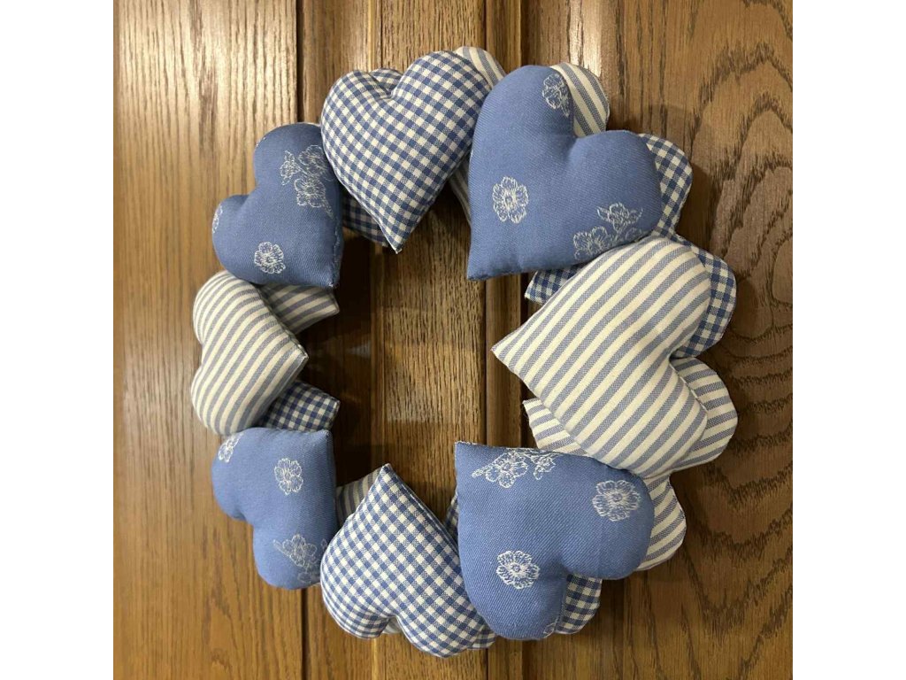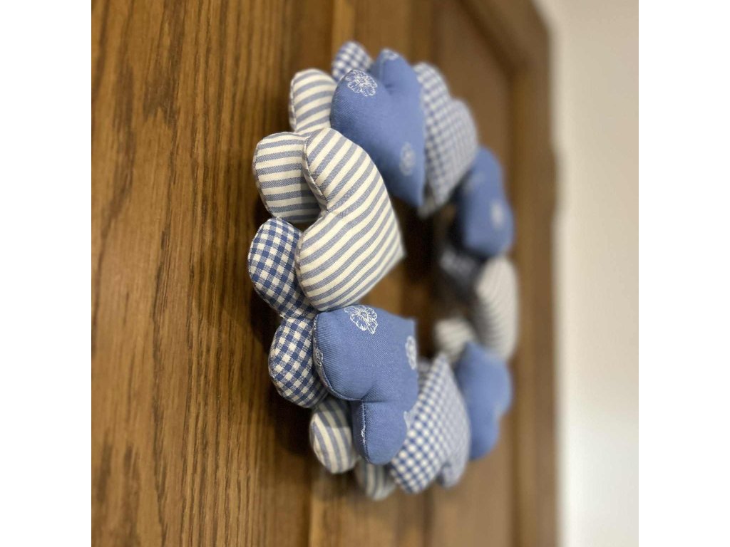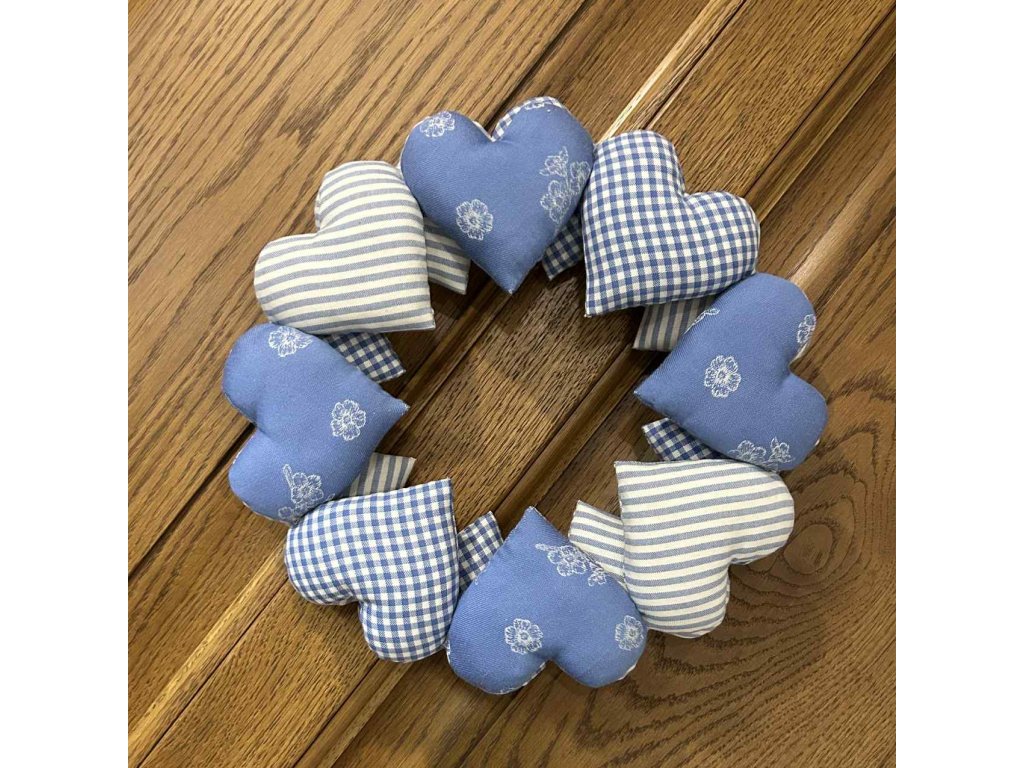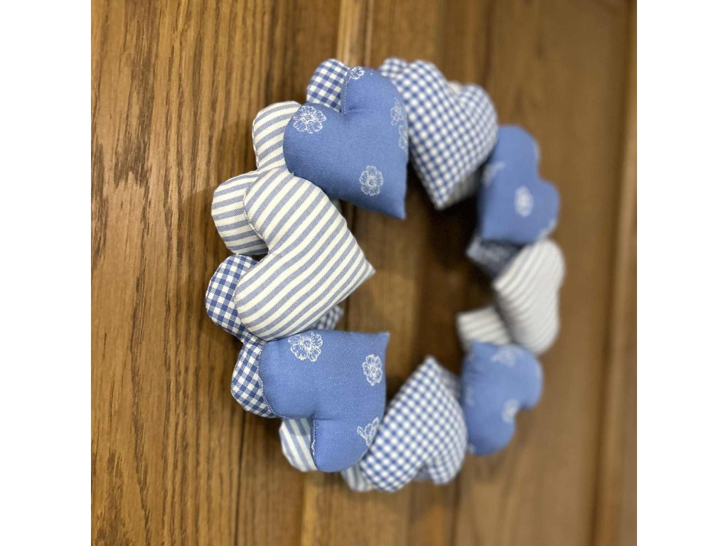 Tento srdíčkový věnec v tónech modrého kanafasu přináší klid a nadčasovou krásu do vašeho domova. Ručně šitá srdíčka z kvalitního světle modrého kanafasu s drobnými vzory jsou poskládána do elegantního věnce, který osloví milovníky venkovského stylu i tradičních dekorací.