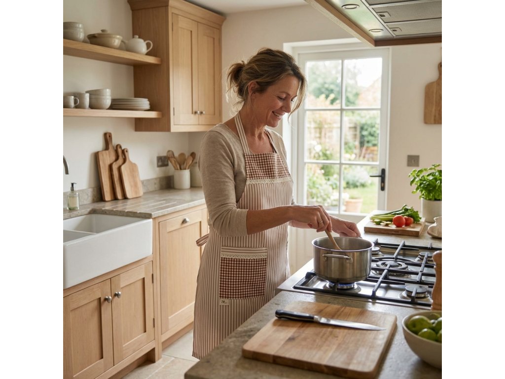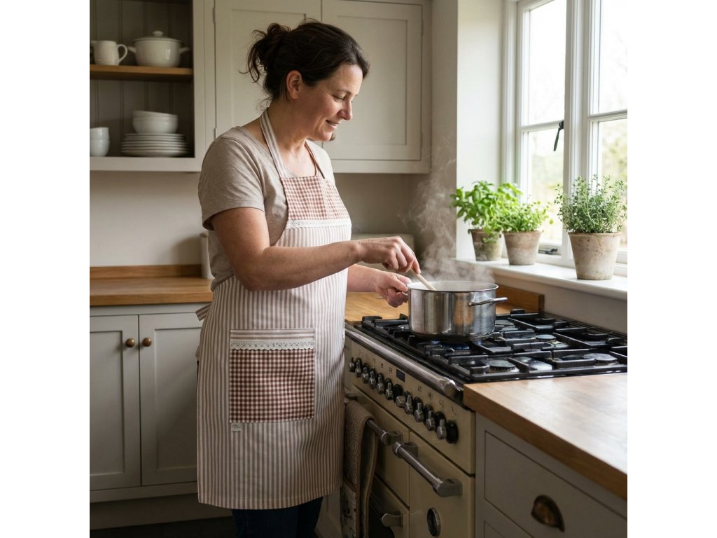 Zástěra z rezavého kanafasu – nadčasový kousek do každé kuchyně. Praktická, pohodlná a s kouzlem venkova.