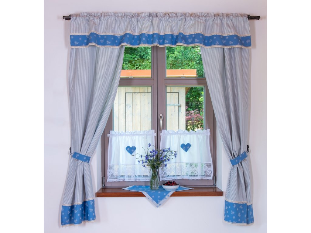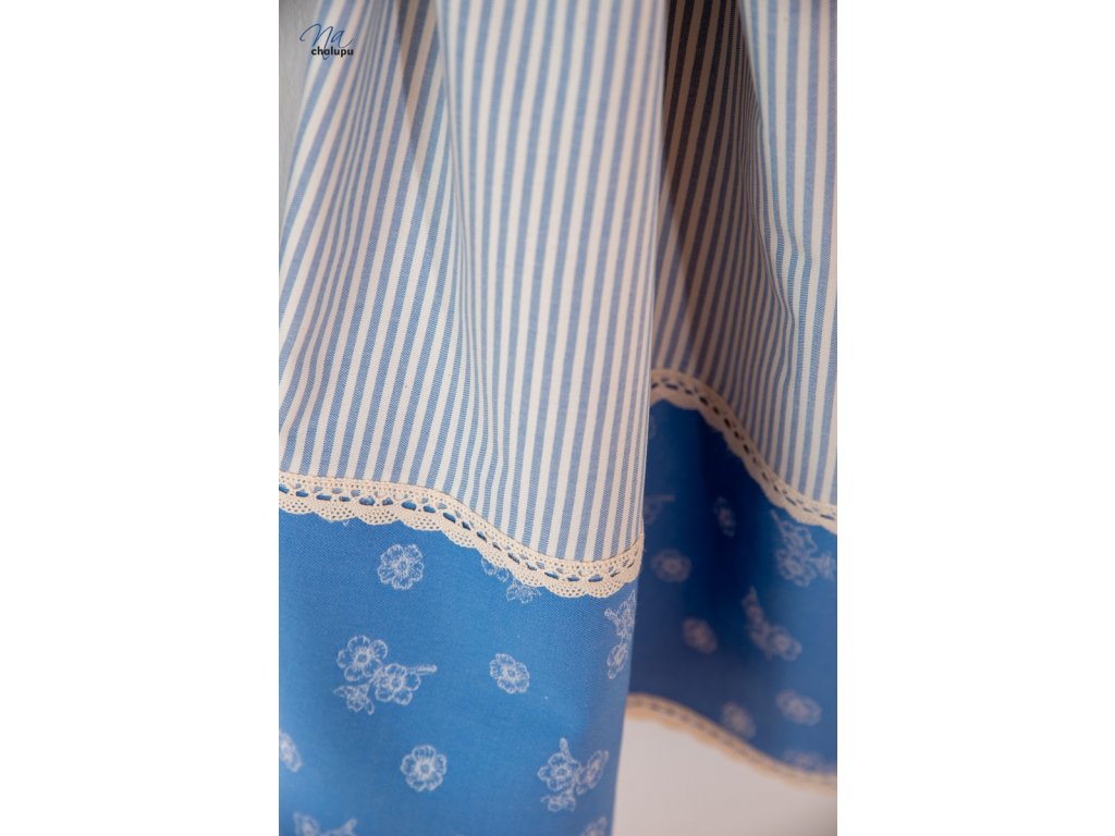 Světle modré proužky s pomněnkami a režnou krajkou závěsům sluší