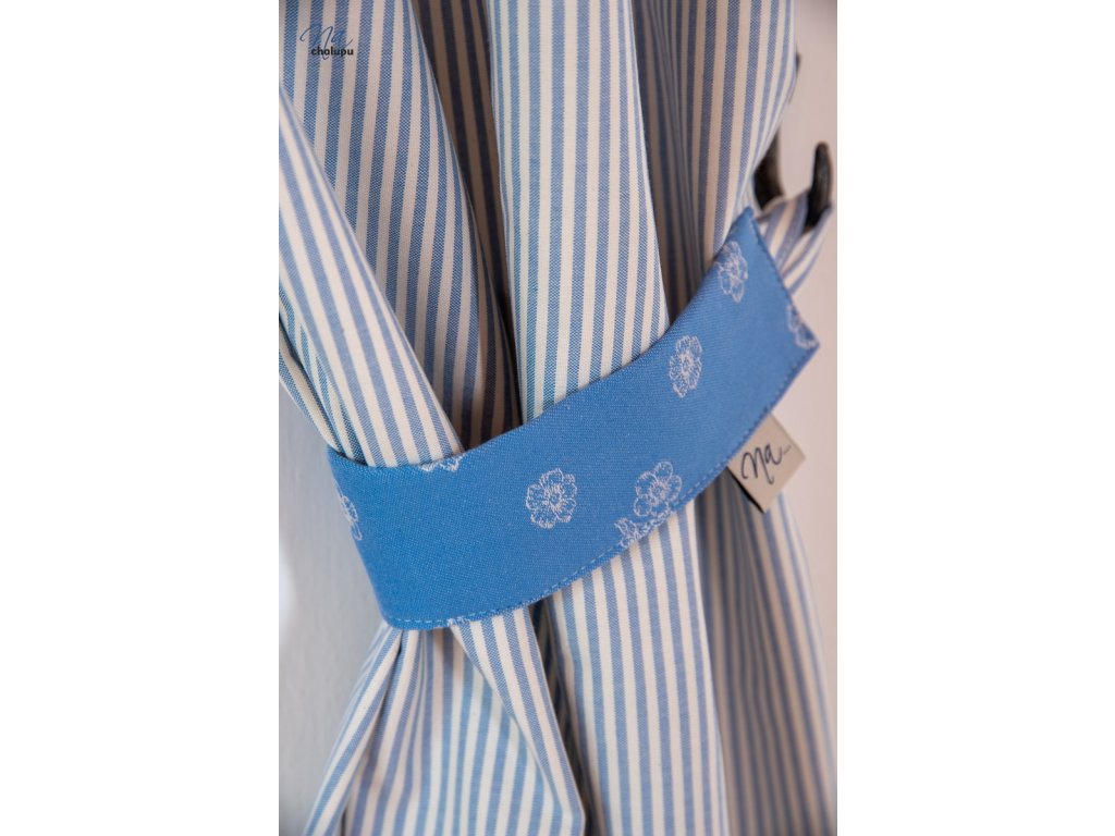 Závěsy ze světle modrého kanafasu proužky a pomněnky